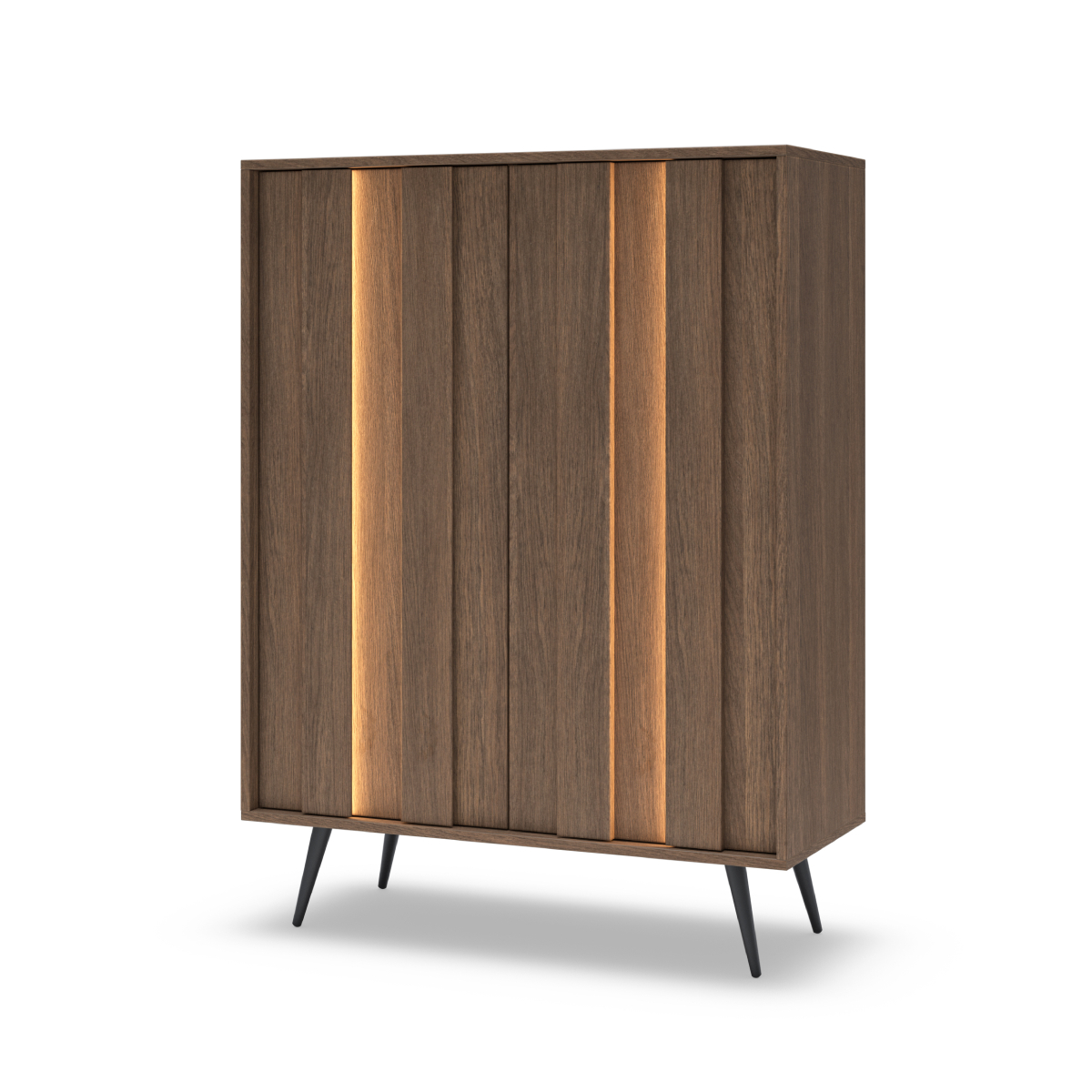 Looking for a stylish, unique furniture set with a bold, modern character? Discover Amaro! The dark color of the wood, combined with decorative, vertical inserts on the fronts and subtle lighting, adds elegance and exceptional depth to the furniture. In the display cabinet, LED lighting is also used inside, behind tempered glass. Simple shapes set on slender metal legs and a handleless design create an impression of lightness and modernity.