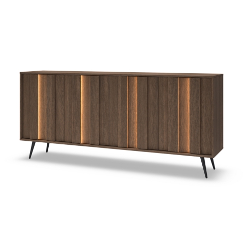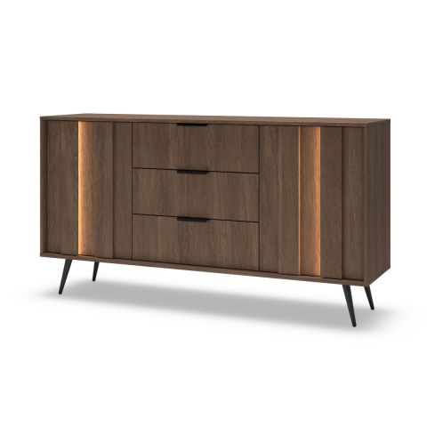 Looking for a stylish, unique furniture set with a bold, modern character? Discover Amaro! The dark color of the wood, combined with decorative, vertical inserts on the fronts and subtle lighting, adds elegance and exceptional depth to the furniture. In the display cabinet, LED lighting is also used inside, behind tempered glass. Simple shapes set on slender metal legs and a handleless design create an impression of lightness and modernity.