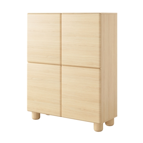 The minimalist form is compiled with soft lines and the warm hue of light wood. The rounded edges of the fronts and the massive, cylindrical legs create a strong stylistic accent, giving the collection a unique, almost sculptural character. The absence of traditional handles allows the collection's natural design to fully resonate. If you're looking for furniture that, instead of dominating a space, envelops it in tranquility and brings harmony, this piece is perfect for you.