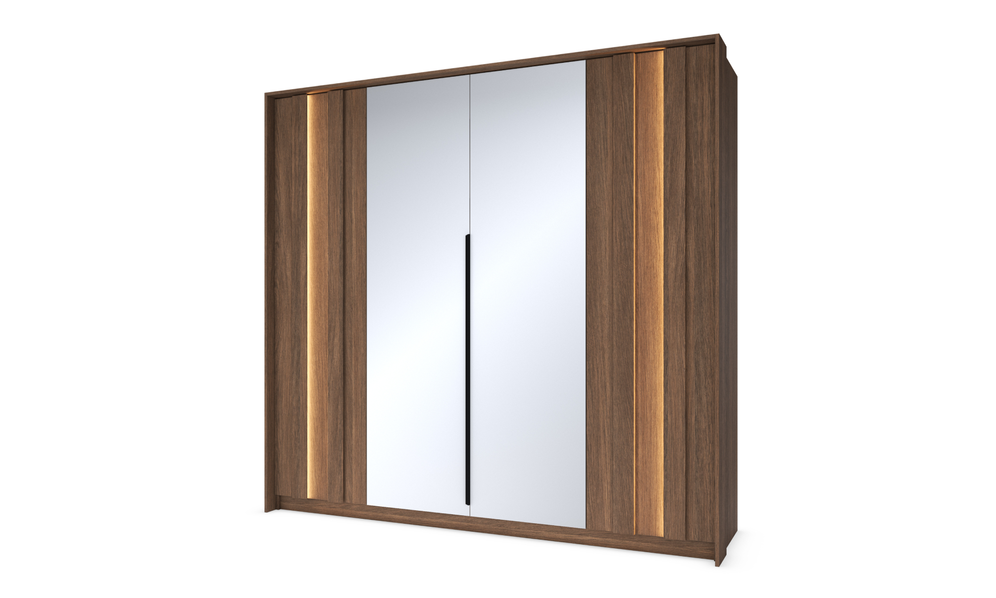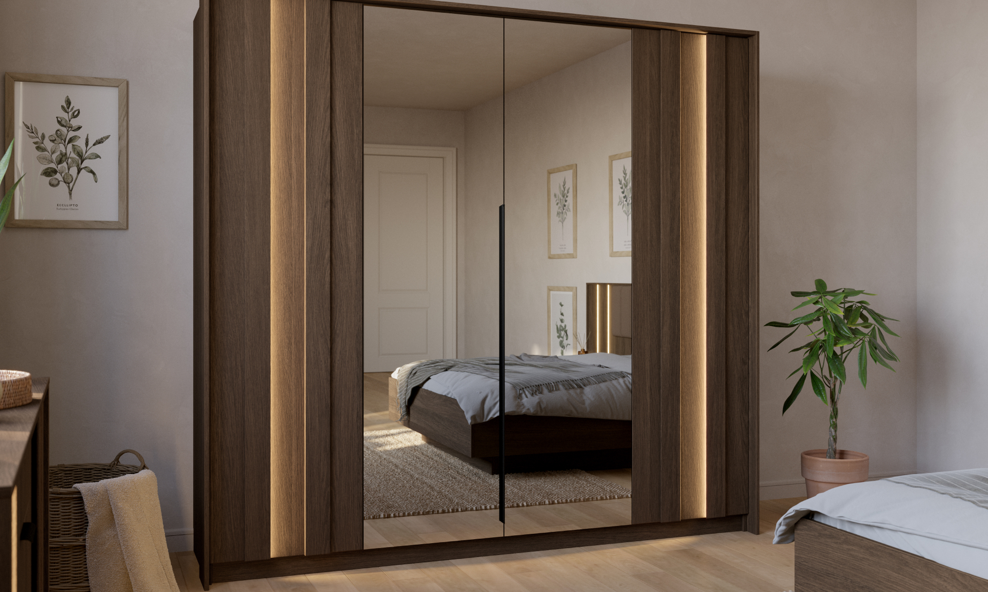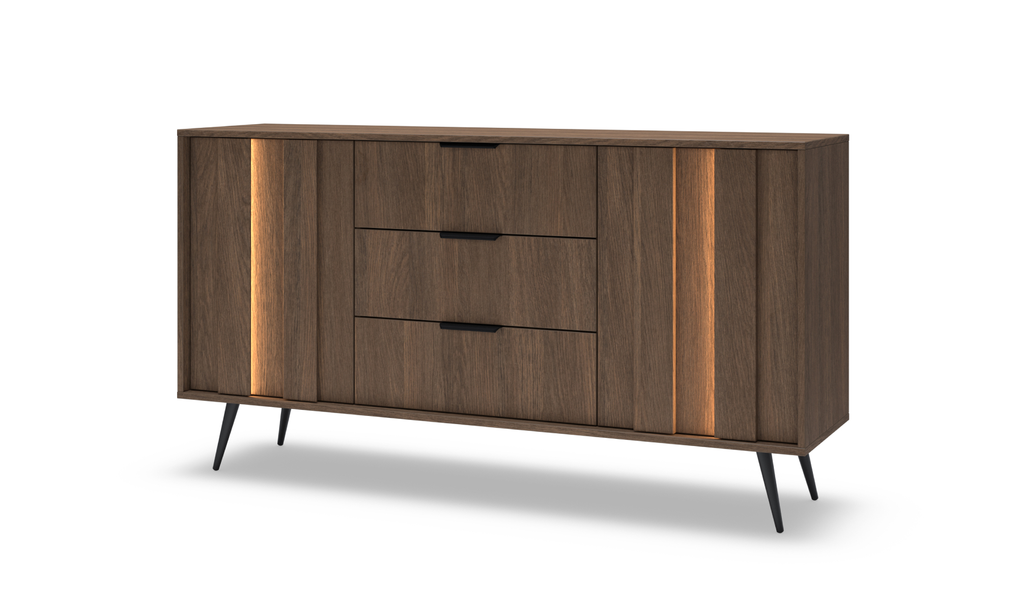 Ten elegancki zestaw mebli do sypialni łączy nowoczesny design z ciepłym odcieniem drewna. Kolekcja została zaprojektowana z myślą o osobach ceniących niepowtarzalny styl i funkcjonalność. Oryginalny detal stanowią pionowe podświetlenia LED. Lekkości bryłom dodają natomiast delikatne, metalowe uchwyty w czarnym kolorze. W łóżku zastosowano tapicerowany zagłówek z dekoracyjnymi przeszyciami. Stwórz w swojej sypialni komfortową przestrzeń sprzyjającą wypoczynkowi!
