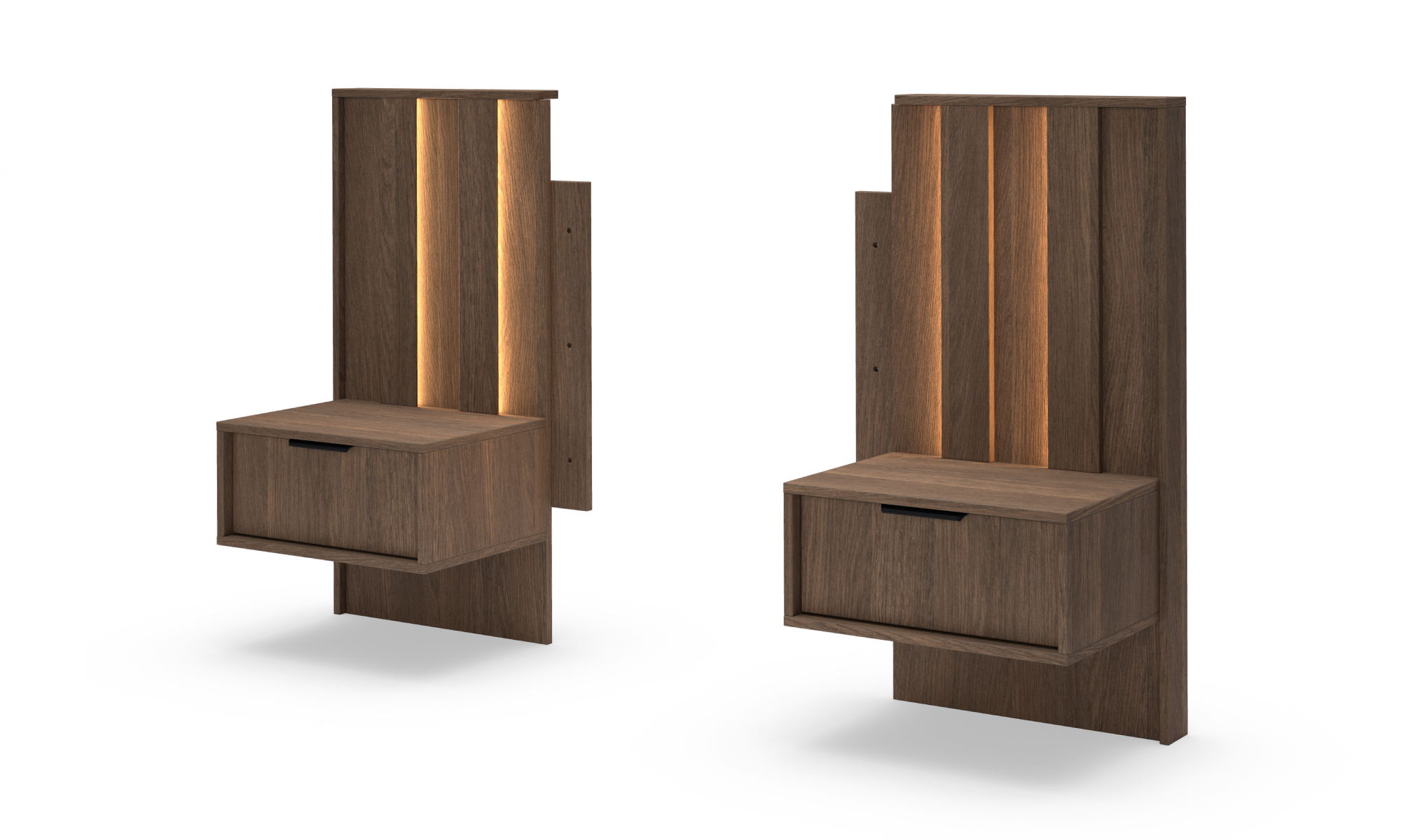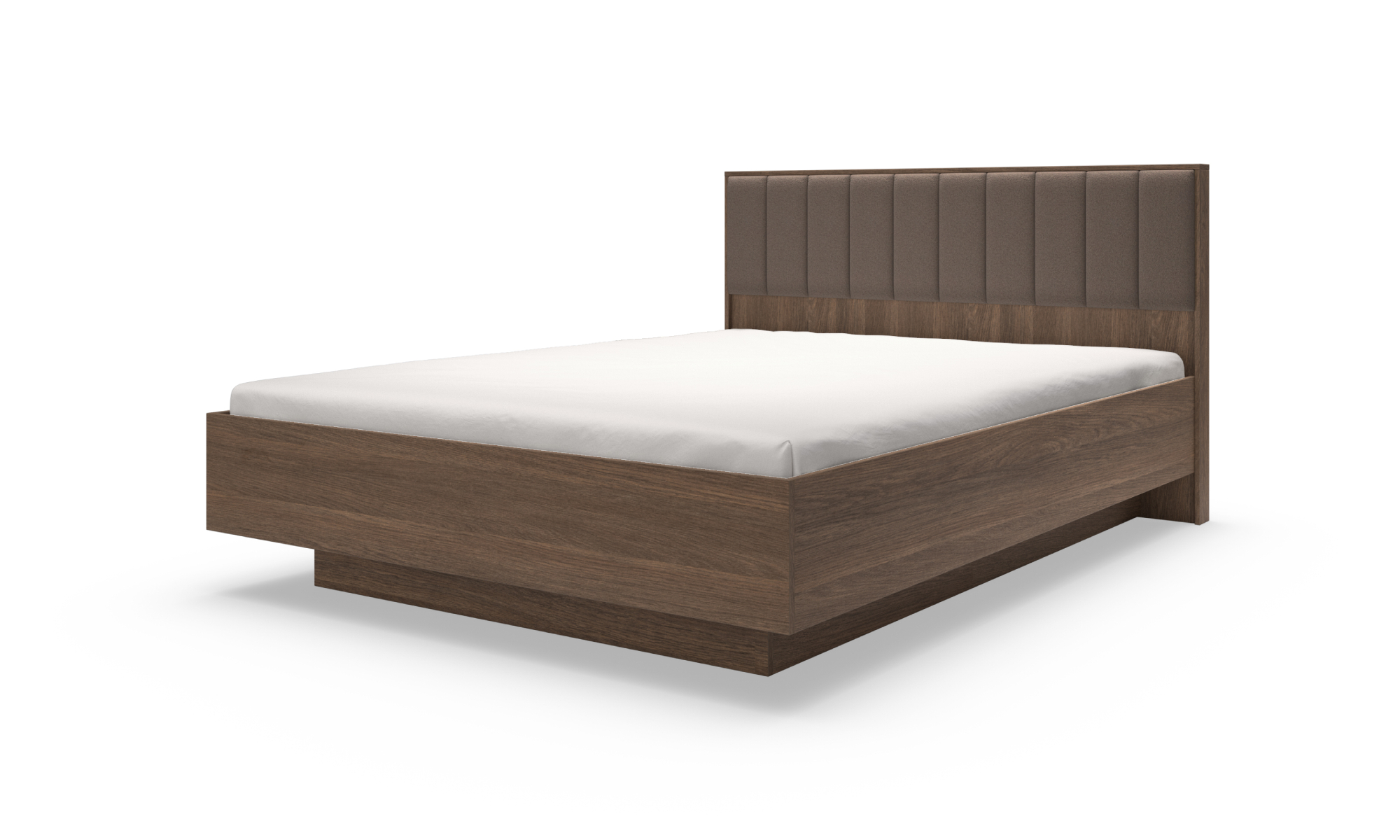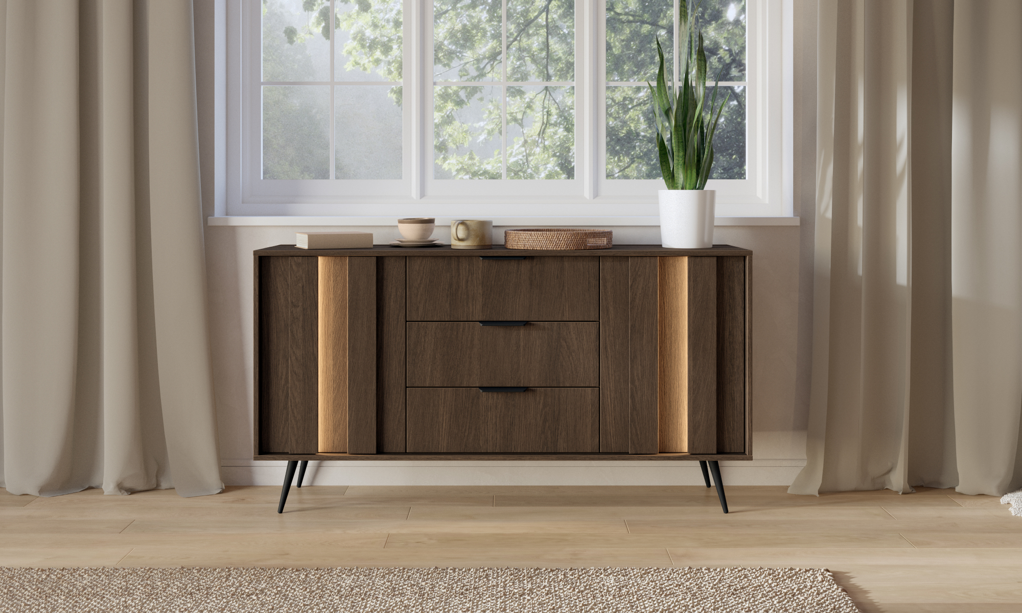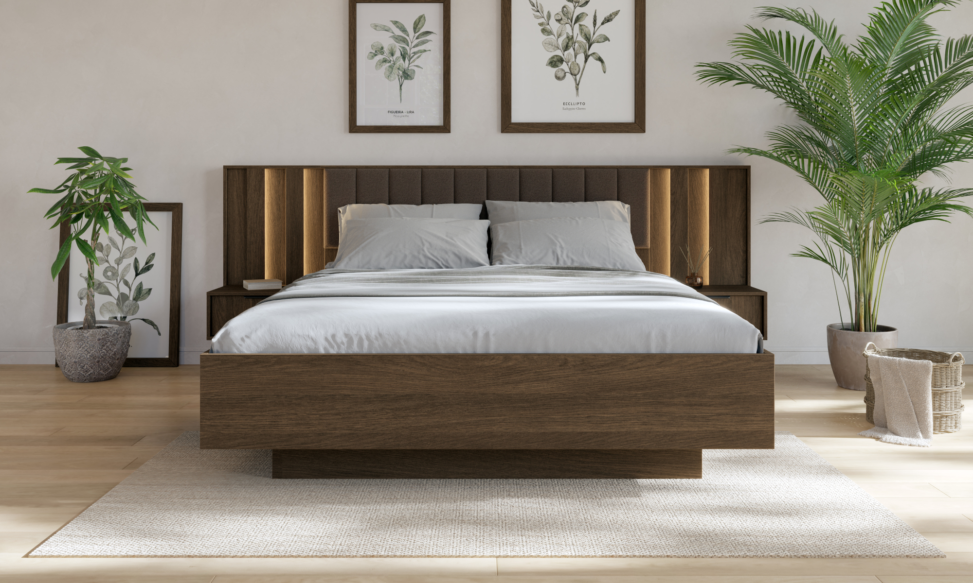 Ten elegancki zestaw mebli do sypialni łączy nowoczesny design z ciepłym odcieniem drewna. Kolekcja została zaprojektowana z myślą o osobach ceniących niepowtarzalny styl i funkcjonalność. Oryginalny detal stanowią pionowe podświetlenia LED. Lekkości bryłom dodają natomiast delikatne, metalowe uchwyty w czarnym kolorze. W łóżku zastosowano tapicerowany zagłówek z dekoracyjnymi przeszyciami. Stwórz w swojej sypialni komfortową przestrzeń sprzyjającą wypoczynkowi!