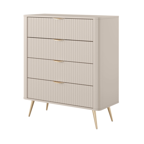 Zestaw Lante pozwoli Ci stworzyć pełną harmonii i delikatności, a jednocześnie modną i szykowną aranżację. Ciepły beż wprowadza do wnętrza spokój i równowagę, doskonale komponując się ze złotymi akcentami, co czyni pomieszczenie przytulnym, a zarazem eleganckim. Natomiast zaoblone krawędzie i ryflowane fronty dodają meblom nowoczesności i oryginalności. W regale na plecach zastosowano płytę HDF w kolorze beżowym ze strukturą drewna. Lante to zestaw stworzony dla tych, którzy uwielbiają nowoczesne formy i subtelną kolorystykę w wydaniu „glamour”.