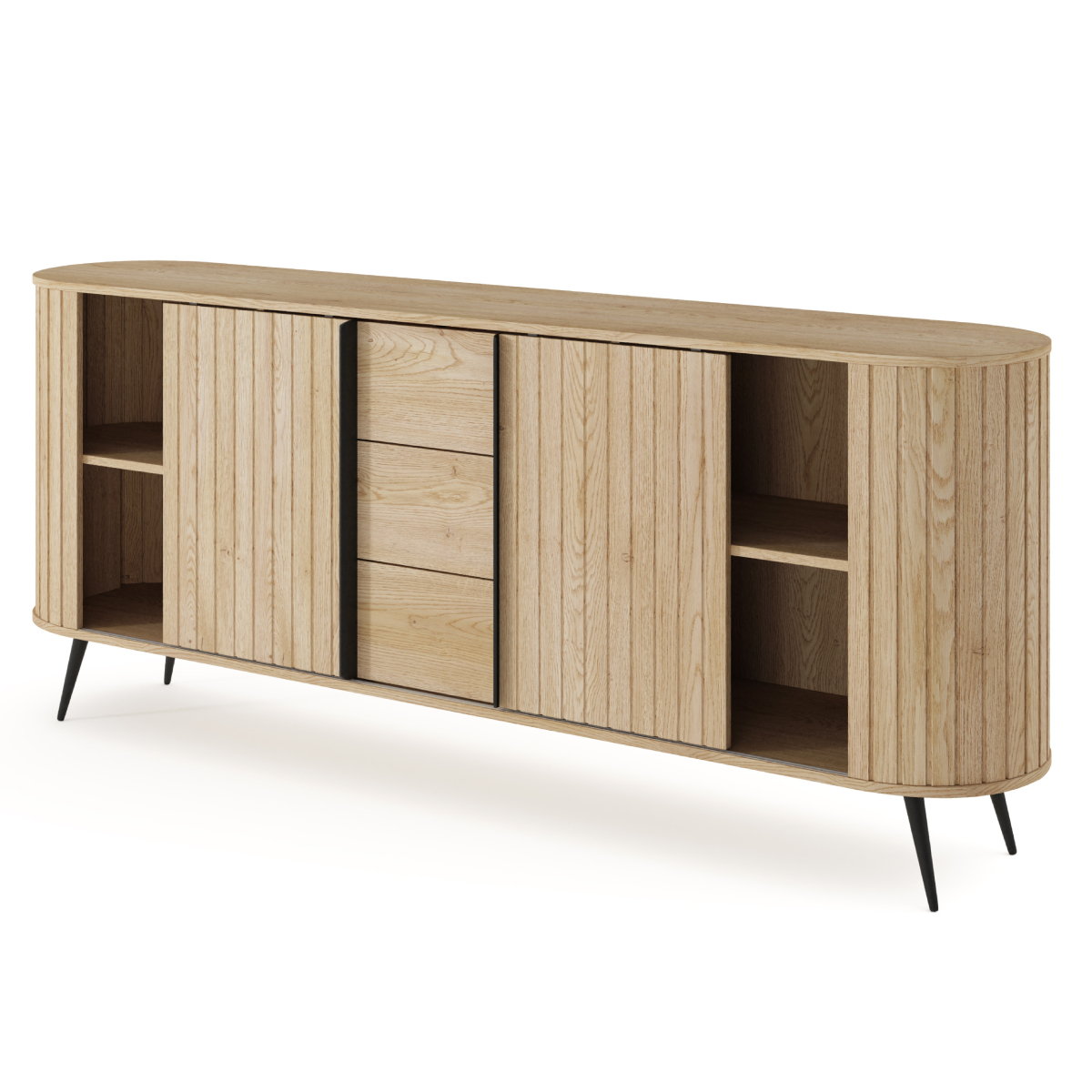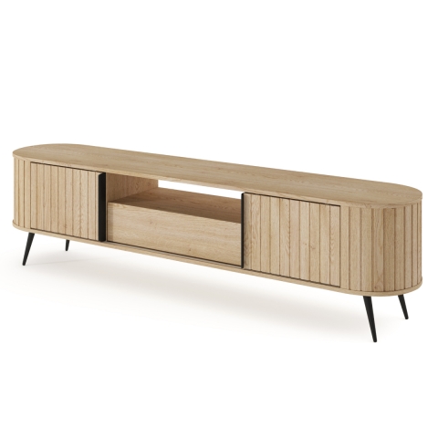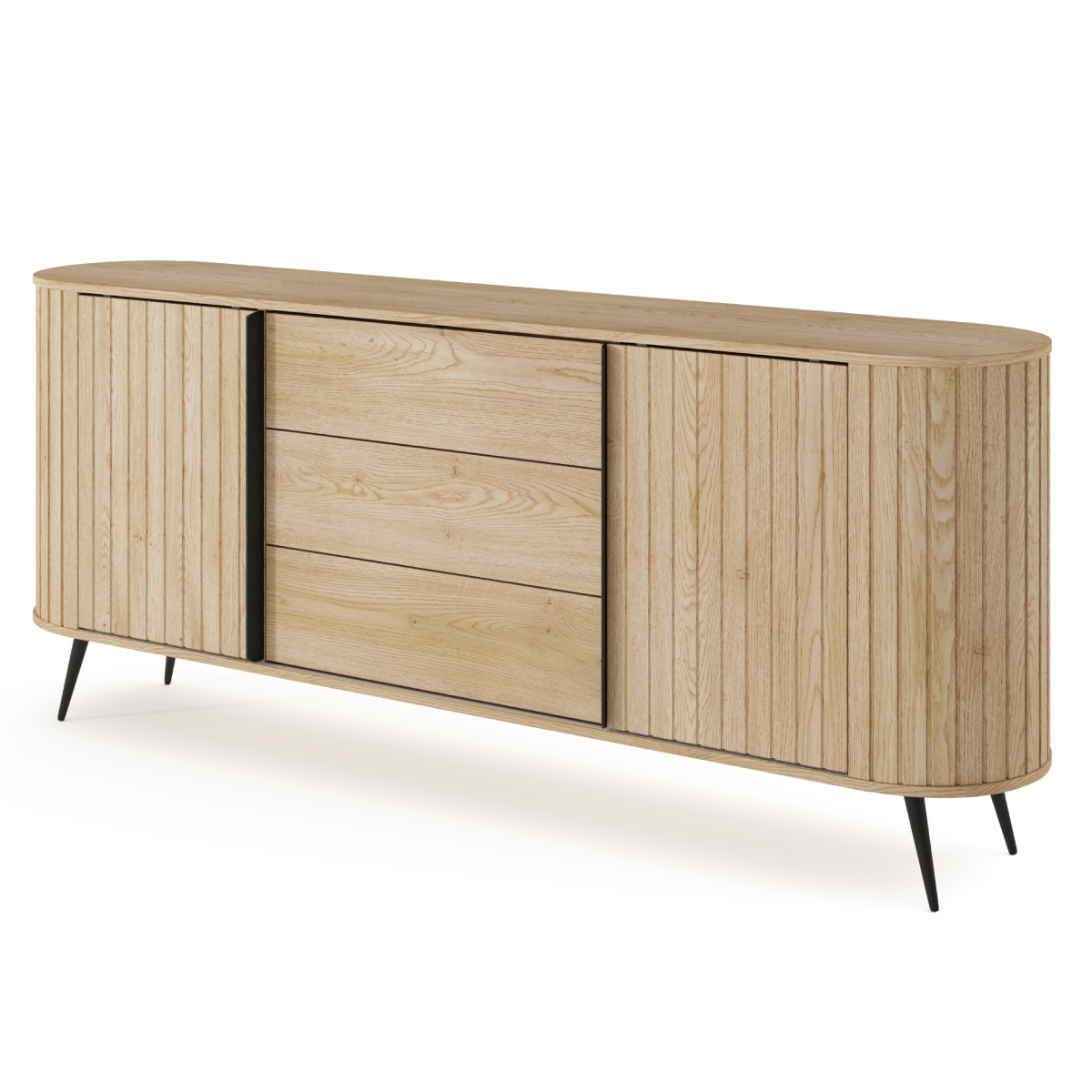 Praktyczna, a zarazem niezwykle stylowa i oryginalna kolekcja Lovi pozwoli Ci na stworzenie nieprzeciętnej, harmonijnie skomponowanej przestrzeni. Subtelna, naturalna kolorystyka dębu cremona rozjaśni Twoje wnętrza oraz doda im naturalności i świeżości. To, co jednak urzeka w tej kolekcji najbardziej, to charakterystyczny kształt brył, stworzony przez zaoblone boki z listew MDF oraz ryflowane fronty w systemie przesuwnym. Całość dopełniają metalowe nogi i uchwyty w czarnym kolorze.