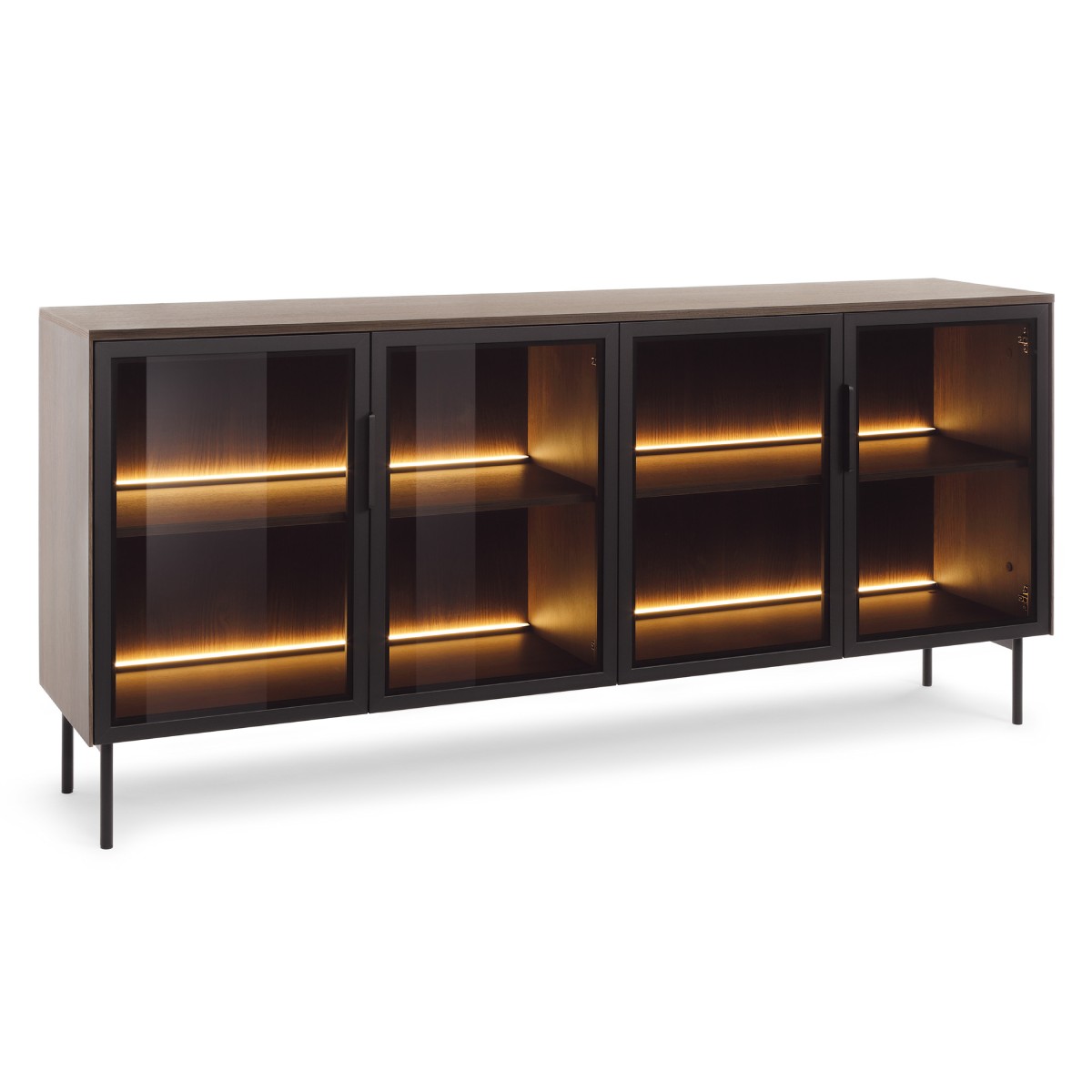 Lumi w kolorze dębu dunin to elegancka i funkcjonalna propozycja. Oryginalny design sprawia, że kolekcja będzie nie tylko estetycznym elementem wyposażenia, ale również praktycznym miejscem do przechowywania rzeczy, nadającym pomieszczeniu osobistego charakteru. Szkło hartowane na frontach zabezpieczy zawartość witryn przed kurzem i uszkodzeniami, a jednocześnie umożliwi wyeksponowanie ulubionych przedmiotów. Czarne, metalowe nóżki i uchwyty dodają meblom lekkości, a oświetlenie wprowadza do wnętrz przytulny nastrój.