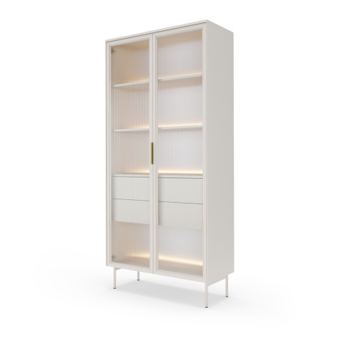 Wybierając kolekcję Lumi w kolorze kaszmirowym, zyskujesz nie tylko zjawiskowe, ale też praktyczne meble. Jasny dekor czyni kolekcję ponadczasową i elegancką. Szkło ornamentowe na frontach sprawia, że meble prezentują się efektownie i lekko, a dodatkowo pozwala na ciekawe wyeksponowanie zawartości poprzez subtelne rozmycie konturów, przy jednoczesnej ochronie przed kurzem. Kunsztu dodają delikatne elementy – metalowe, złote uchwyty oraz smukłe, metalowe nogi w kolorze kaszmirowym. Dodatkową zaletą jest oświetlenie wnętrza.